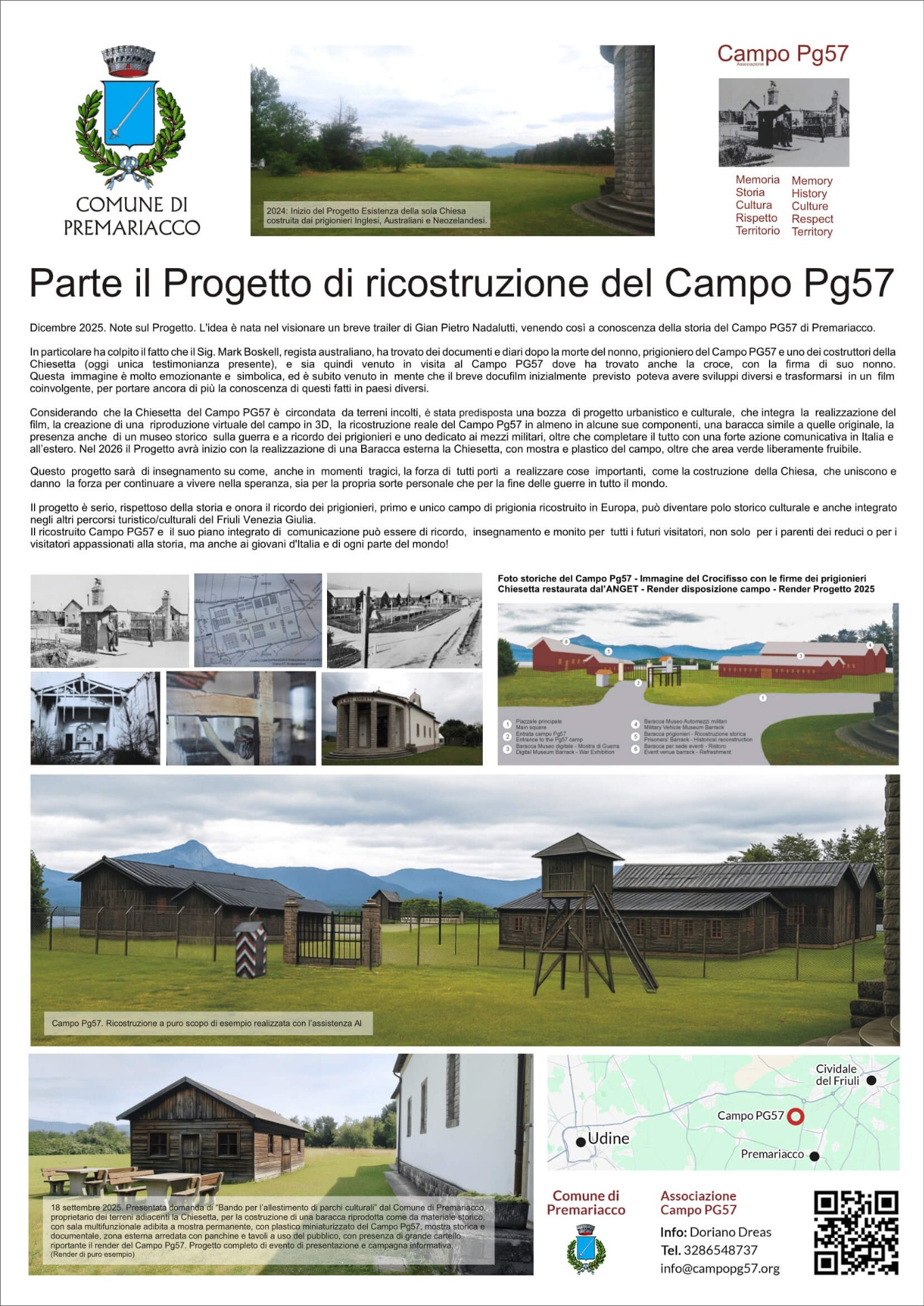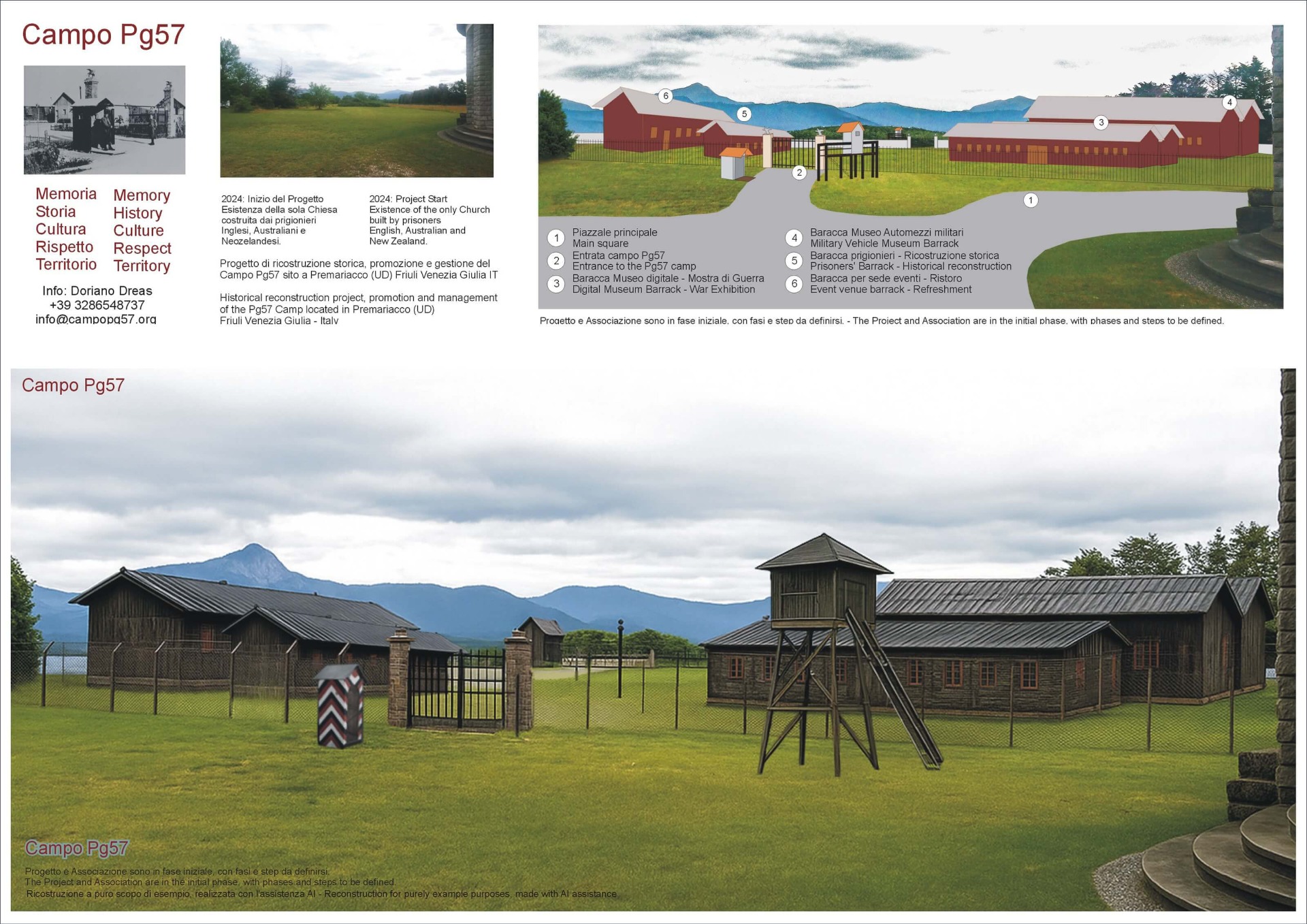 Il progetto prevede una sala multifunzionale adibita a mostra permanente con plastico miniaturizzato del Campo PG57, una mostra storica documentale e una zona esterna arredata con panchine e tavoli a uso del pubblico. Completa il sito la presenza di un grande cartellone riportante il render della ricostruzione del Campo PG57. Inclusi anche evento di presentazione e campagna informativa.